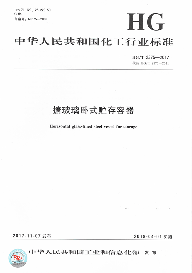 ?? 2011 年 制定行業(yè)標準 HG/T 2375-2011《搪玻璃臥式貯存容器》;